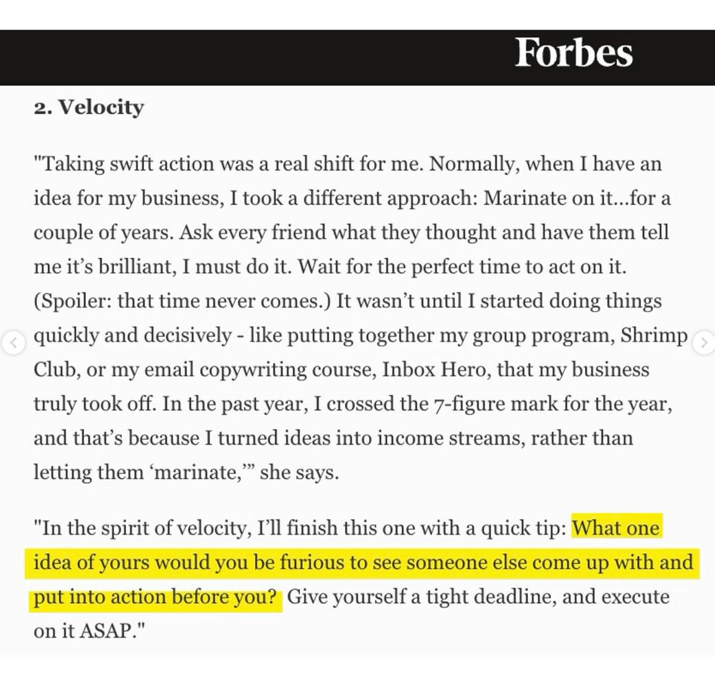 Let’s just say that this Instagram post by OG newsletter writer, Laura Belgray, resonates. She’s talking here about business ideas but it could be any idea.